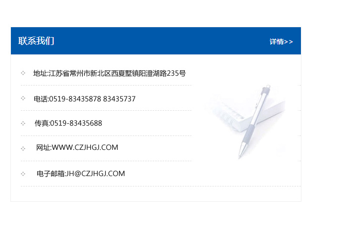 傳真:0519-83435688    郵編:213135    網址:WWW.czjhgj_com.99910086.com    電子郵箱:JH@czjhgj_com.99910086.com